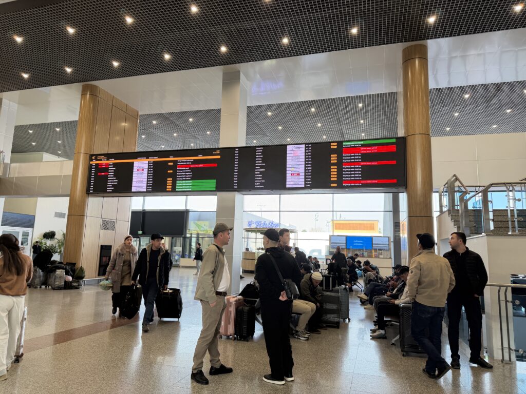 翌日、キルギスに帰るためにタシケントの空港を訪れると、ドバイ行きなど一部の便がキャンセルになっていました。この日は人はあまり多くありませんでしたが、キャンセル便を気にして待っている様子の人は見られました。