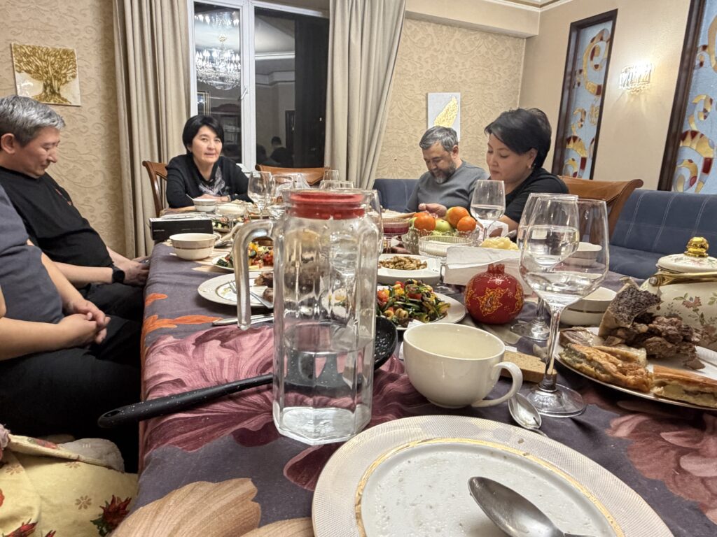 私もお手伝いしましたが、テーブルには新鮮なサラダやサーモン、そして私の大好物であるキルギス伝統料理「ビシュパルマク」など、数えきれないほどの料理が並びました。