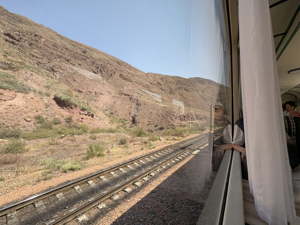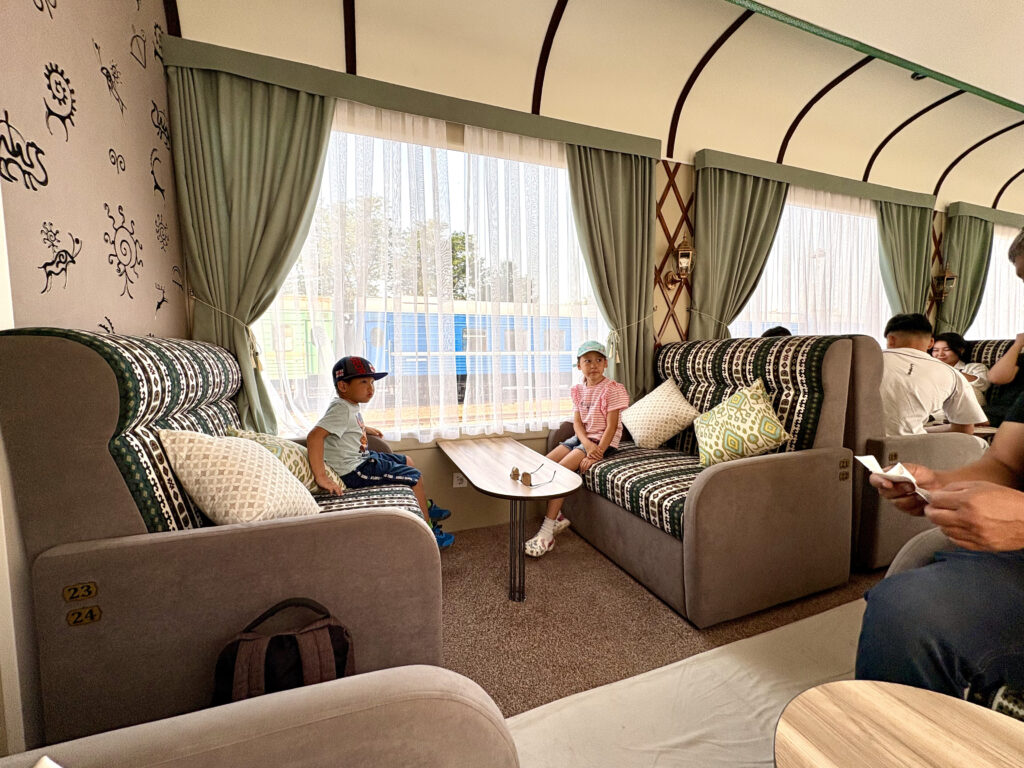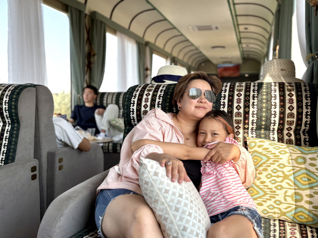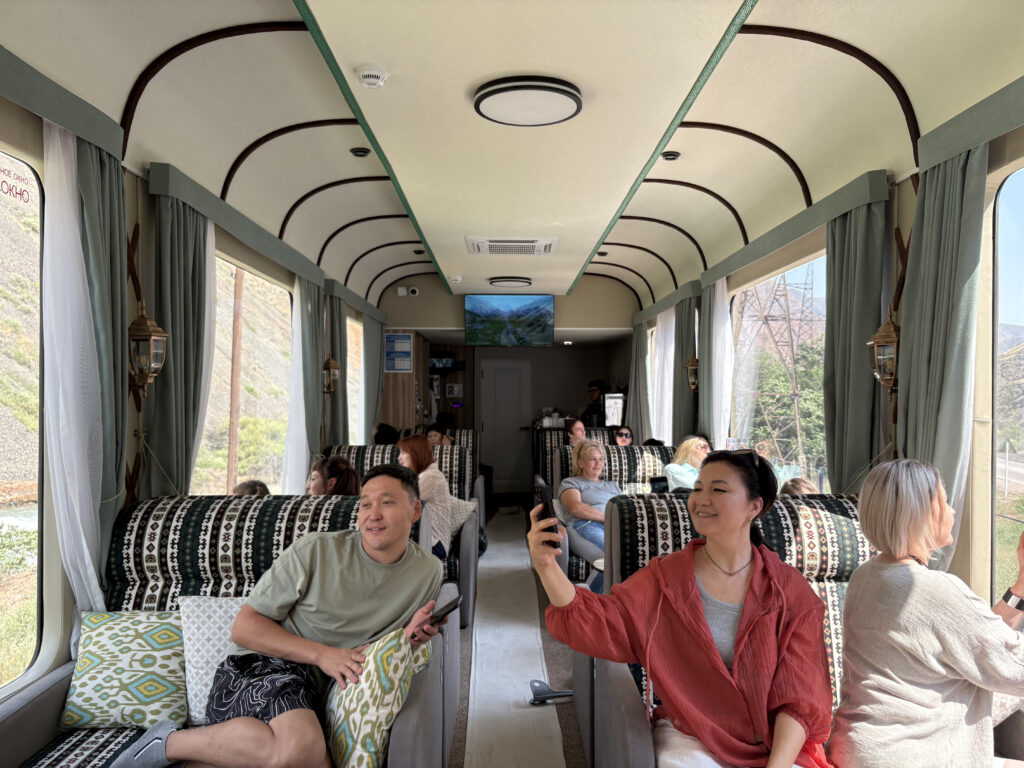 夏だけ走るビシュケク発の観光列車に、日本語ガイドと一緒に乗車。VIP席は冷房完備で窓が大きく、天山山脈の峰々が車窓いっぱいに広がる特別な移動体験です。