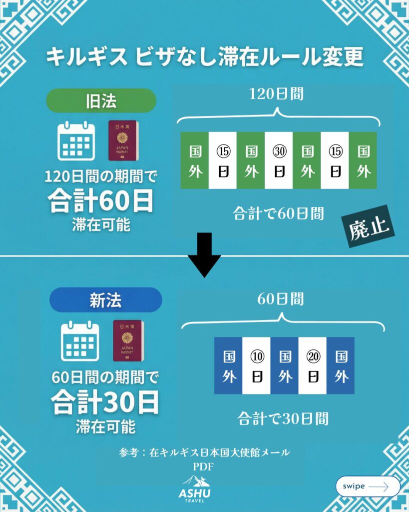 これまで「120日間のあいだで合計60日まで」滞在できたキルギスの無査証制度が、2026年から「60日間のあいだで合計30日まで」に短縮されます。