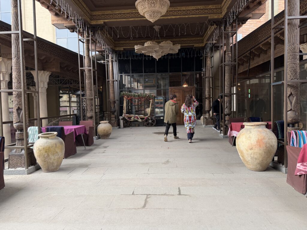 ロビーに入ると、カラフルな食器・モザイクタイル・シャンデリアなどの伝統的ウズベキスタンスタイルのインテリア。アンティーク調でウズベキスタンらしさ全開。